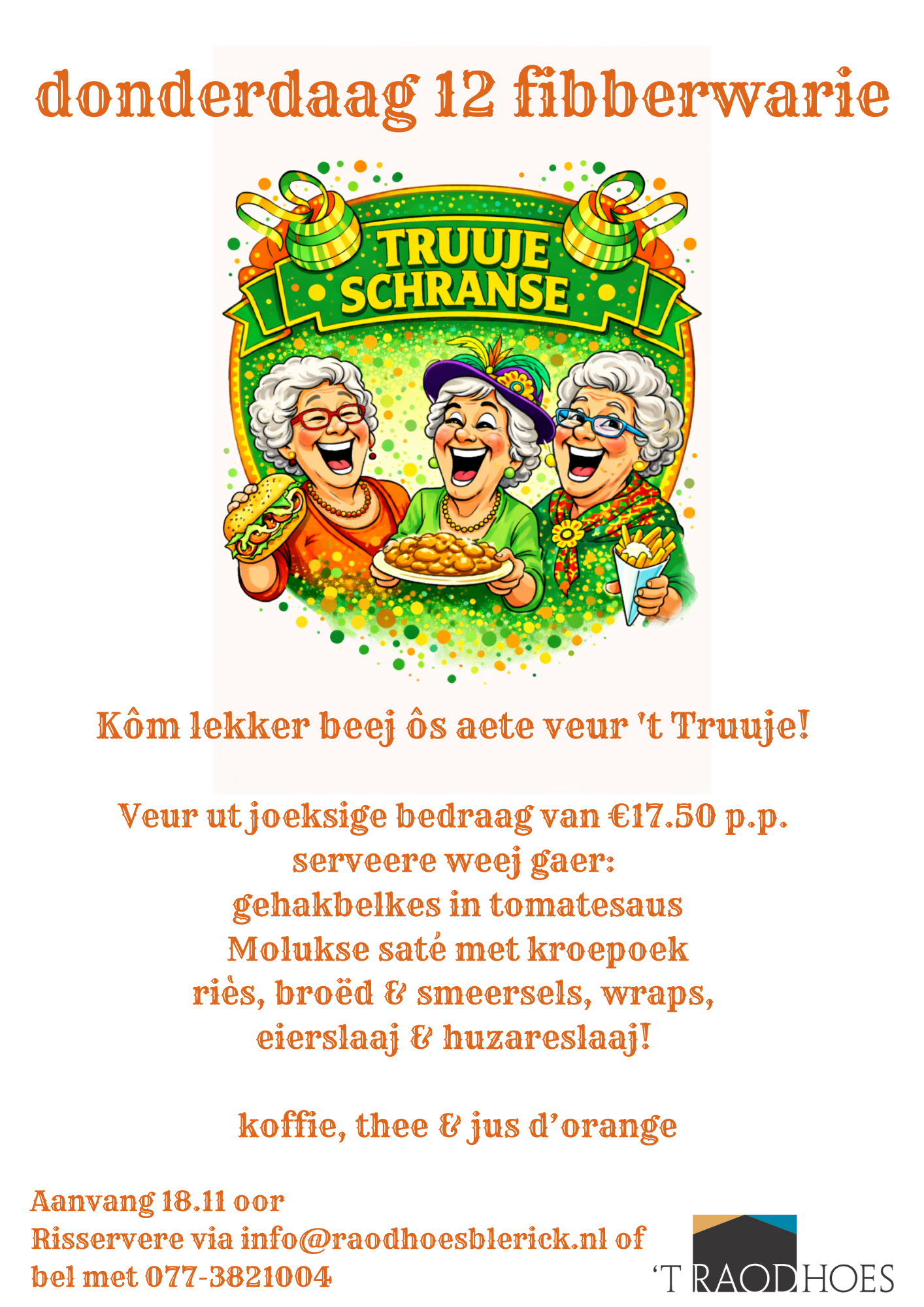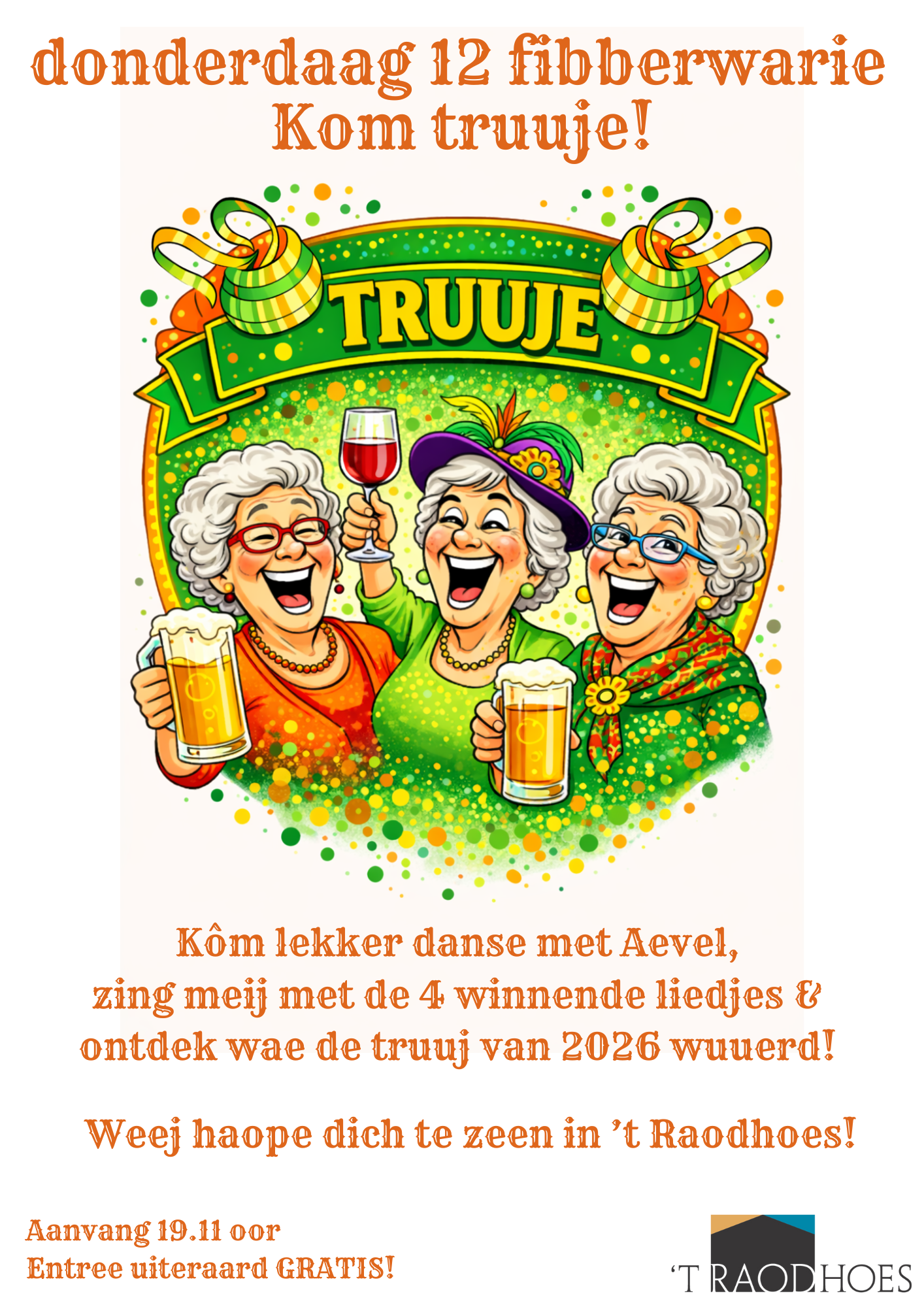 Op 12 fibberwarie is 't Raodhoes weer van en veur alle Truuje in Groët Venlo en wiet dao boëte!! Van te veure eine gooije baom legge? Det kin! Ein oetgebreid…